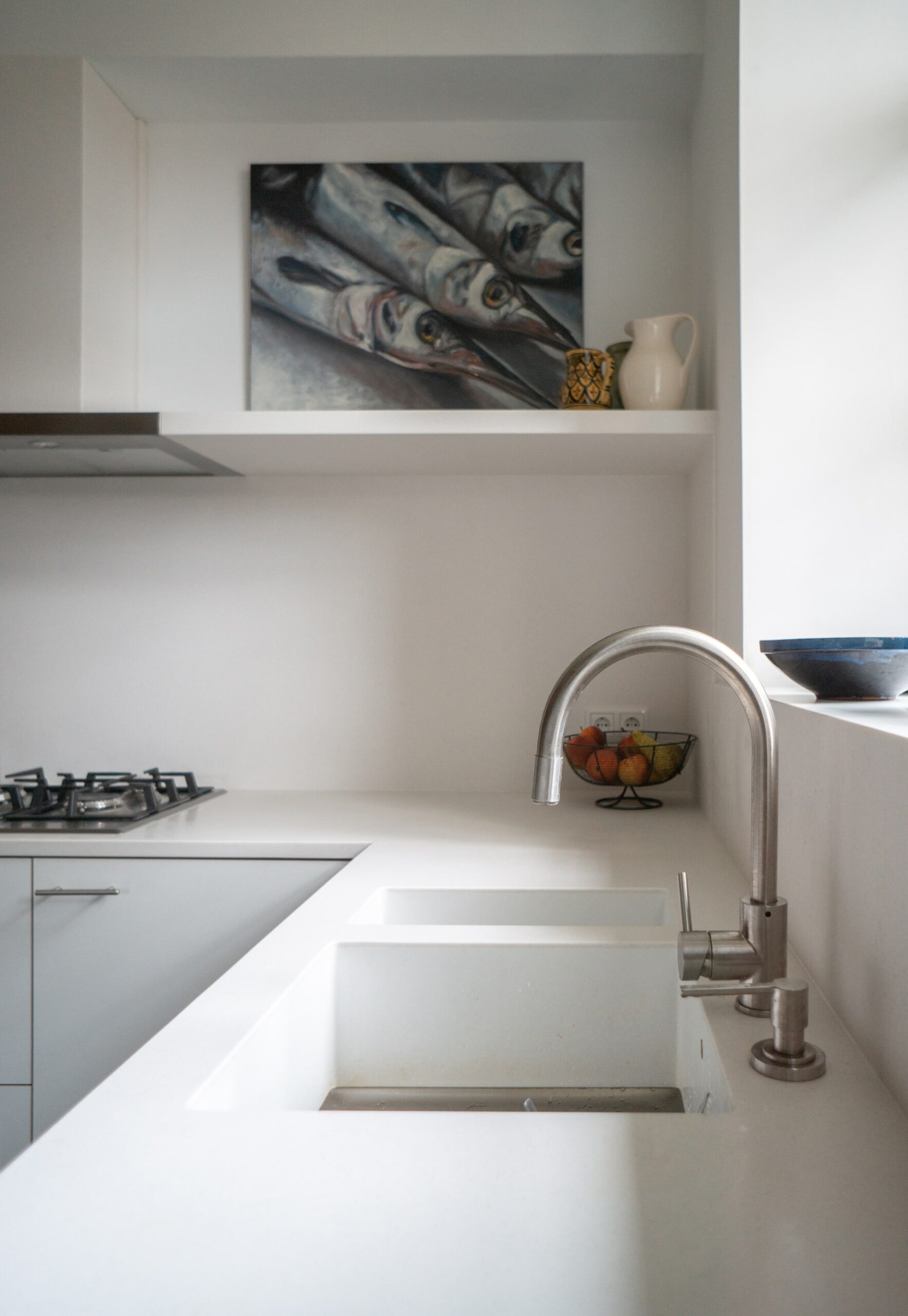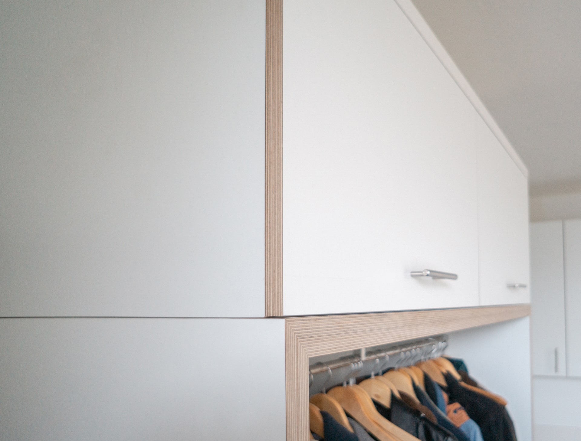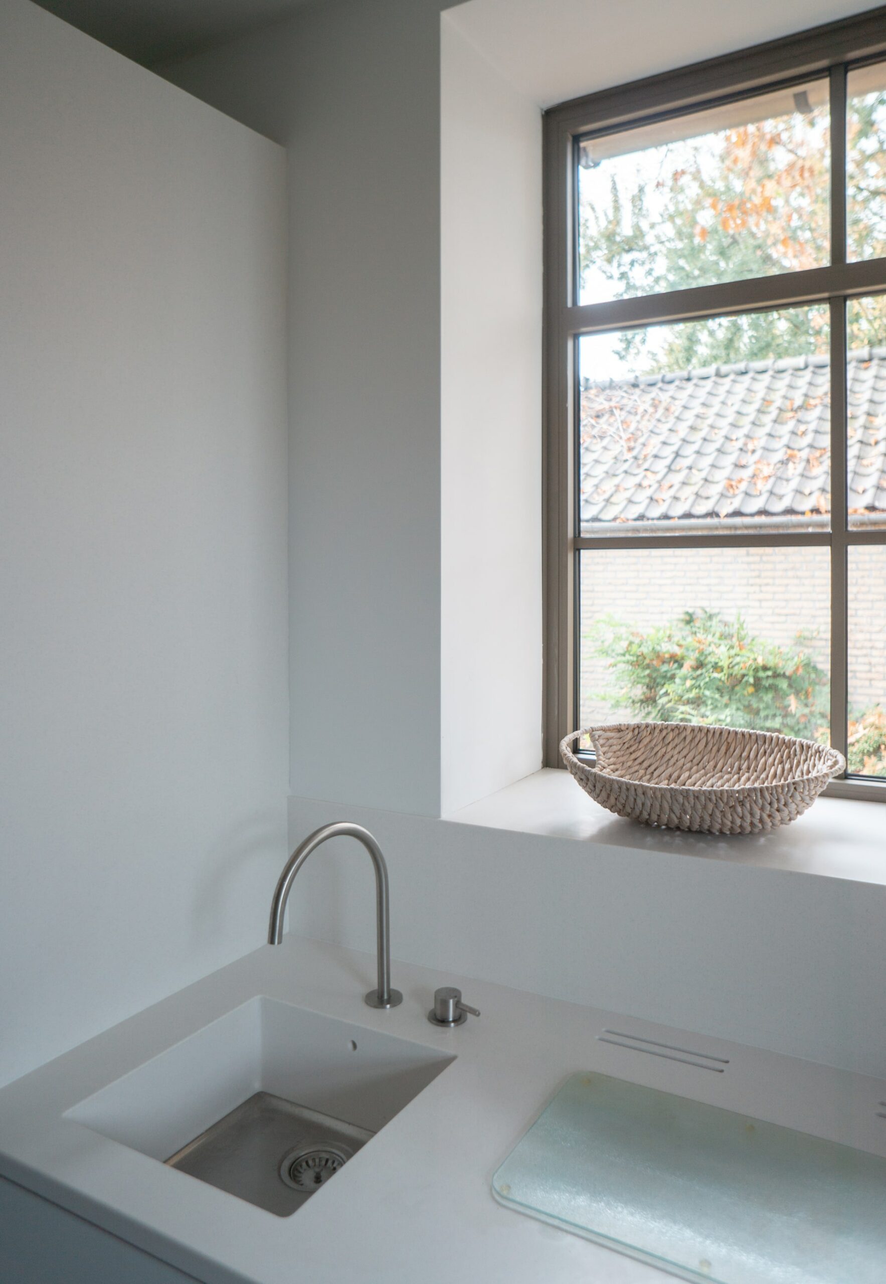 Yet that is precisely what we have done here. Because the bunker looked heavy and dark, there was a demand for a lighter character. From the dark stone kitchen floor, the soft white birch concrete plywood of the kitchen now forms a bright element. The composite kitchen worktop rests on it as a whitish line. The colours of the window frames are deliberately in tune with the innovative colour composition of the entire building. Thus, they continue to blend into the ensemble of bunker houses. The new window frames and applied post-insulation of the roof serve as protection like the original bunker, yet now in a sustainable sense. This building with its heritage is now ready for the future.